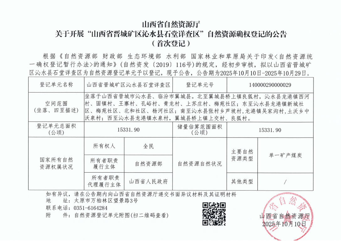 山西省自然资源厅关于开展“山西省晋城矿区沁水县石堂详查区”自然资源确权登记的公告(首次登记)