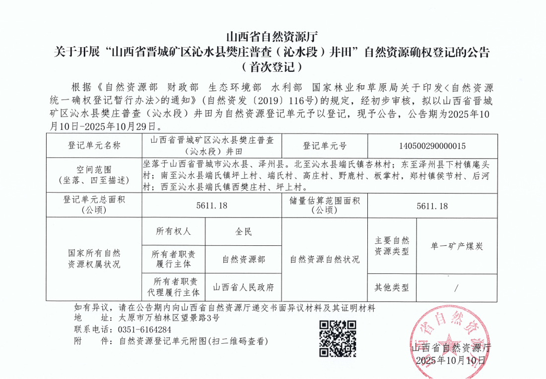 山西省自然资源厅关于开展“山西省晋城矿区沁水县樊庄普查(沁水段)井田”自然资源确权登记的公告(首次登记)