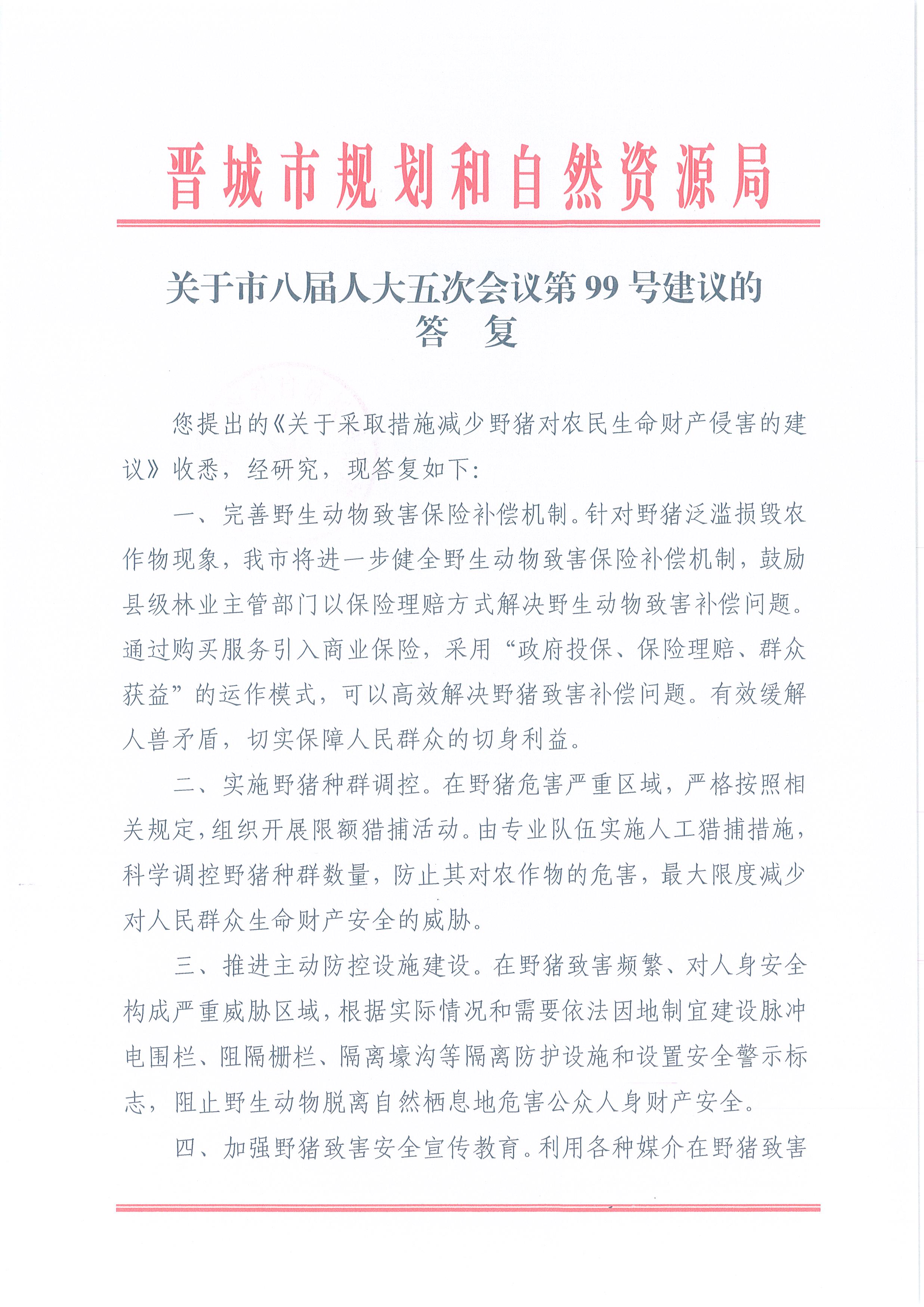 关于市八届人大五次会议第99号建议的答复
