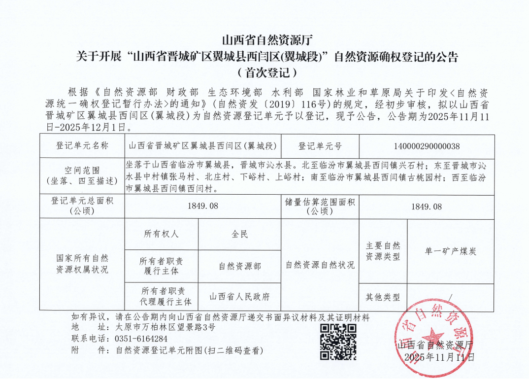 山西省自然资源厅关于开展“山西省晋城矿区翼城县西闫区(翼城段)”自然资源确权登记的公告(首次登记)