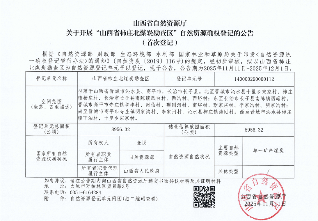 山西省自然资源厅关于开展“山西省柿庄北煤炭勘查区”自然资源确权登记的公告(首次登记)