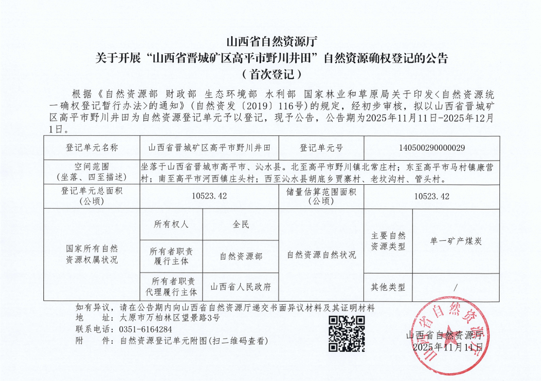 山西省自然资源厅关于开展“山西省晋城矿区高平市野川井田”自然资源确权登记的公告(首次登记)