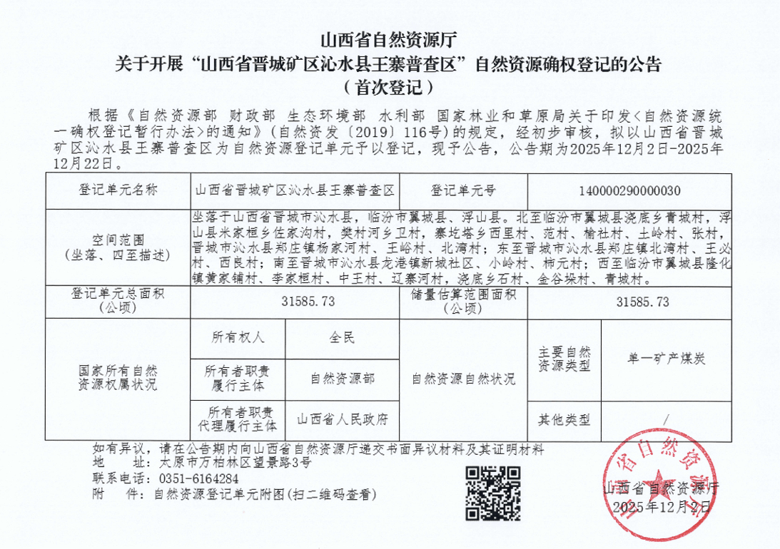 山西省自然资源厅关于开展“山西省晋城矿区沁水县王寨普查区”自然资源确权登记的公告(首次登记)