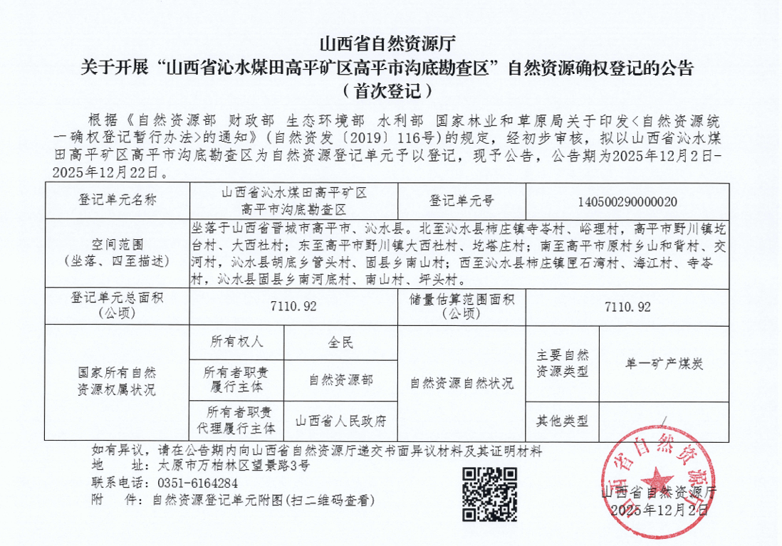 山西省自然资源厅关于开展“山西省沁水煤田高平矿区高平市沟底勘查区”自然资源确权登记的公告(首次登记)
