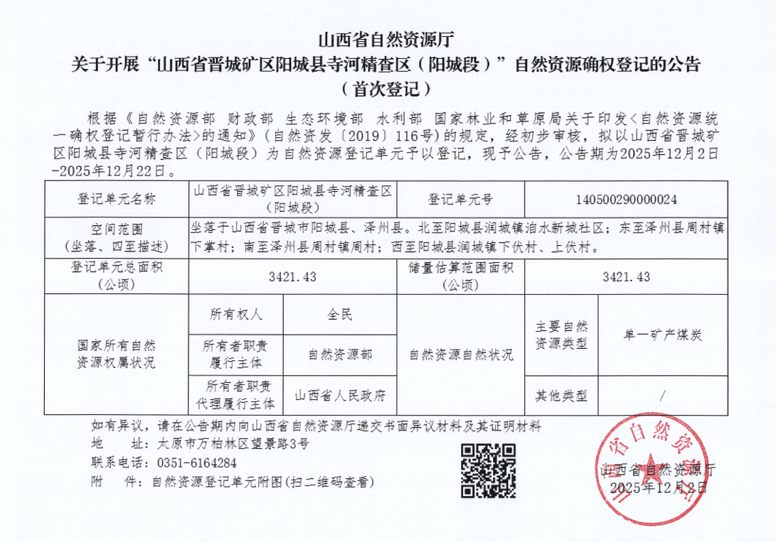 山西省自然资源厅关于开展“山西省晋城矿区阳城县寺河精查区(阳城段)”自然资源确权登记的公告(首次登记)